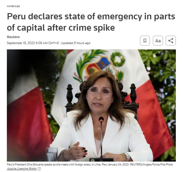 中新網(wǎng)9月19日電 據(jù)路透社報道,當(dāng)?shù)貢r間18日,秘魯總統(tǒng)博盧阿特表示,秘魯政府已宣布首都利馬市三個犯罪率飆升的地區(qū)進(jìn)入緊急狀態(tài),這一措施允許軍方協(xié)助政府加強(qiáng)地區(qū)安全管控。