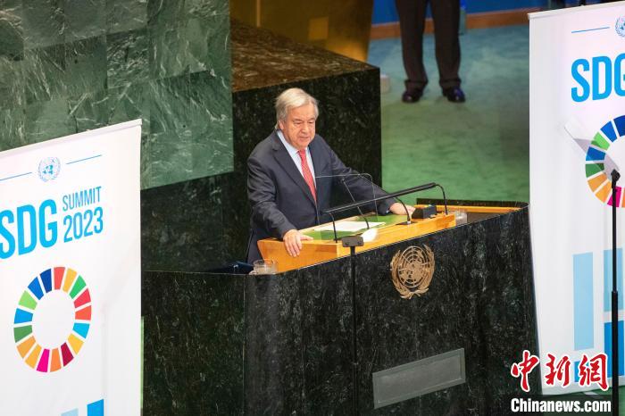 當(dāng)?shù)貢r間9月18日,聯(lián)合國可持續(xù)發(fā)展目標(biāo)峰會在紐約聯(lián)合國總部拉開帷幕。當(dāng)天,聯(lián)大通過一項政治宣言,會員國承諾加速實現(xiàn)2030年可持續(xù)發(fā)展目標(biāo)。圖為聯(lián)合國秘書長古特雷斯發(fā)表講話?!≈行律缬浾?王帆 攝