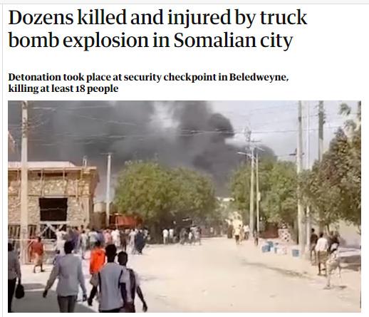 中新網(wǎng)9月24日電 據(jù)英國《衛(wèi)報》報道,索馬里當局表示,當?shù)貢r間23日,位于索馬里中部城鎮(zhèn)貝萊德文的一個安全檢查站發(fā)生爆炸,造成至少18人身亡、40人受傷。
