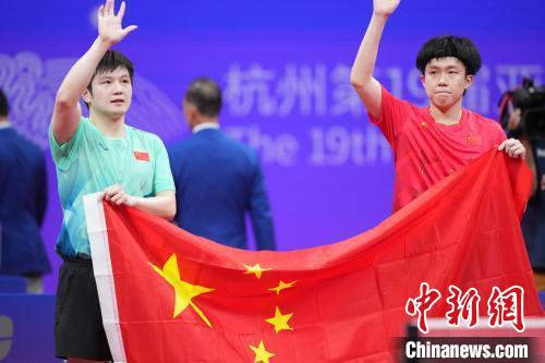 10月2日,杭州第19屆亞運(yùn)會(huì)乒乓球男子單打決賽在拱墅運(yùn)河體育公園體育館舉行,中國(guó)選手王楚欽4比3戰(zhàn)勝隊(duì)友樊振東,獲得冠軍。圖為王楚欽(右)與樊振東在賽后手持國(guó)旗向觀眾致意?!≈行律缬浾?田博川 攝