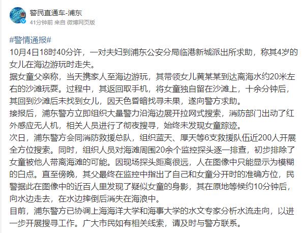中新網(wǎng)10月6日電 據(jù)上海市公安局浦東分局官方微博消息,上海浦東警方發(fā)布一則通報:10月4日18時40分許,一對夫婦到浦東公安分局臨港新城派出所求助,稱其4歲的女兒在海邊游玩時走失。