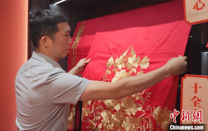 8月28日,“臺(tái)二代”、湖南富麗真金家紡有限公司總經(jīng)理杜俊毅在展廳整理產(chǎn)品?!钍篮?攝