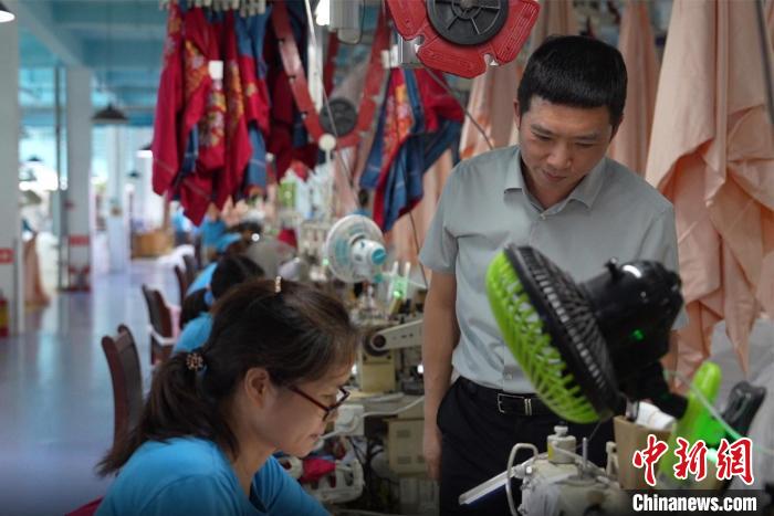 8月28日,“臺(tái)二代”、湖南富麗真金家紡有限公司總經(jīng)理杜俊毅(右)在車(chē)間與員工交流?!钍篮?攝