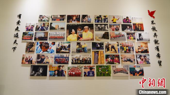 在秦榮華家中的墻上,掛著他過去30多年來在大陸各地走訪、參與公益、推動兩岸交流的照片。 中新社記者 楊程晨 攝