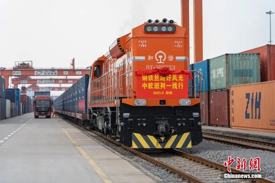 2023年9月17日,河南鄭州,一列滿載醫(yī)療器械、汽車(chē)配件等貨物的中歐班列(鄭州)從中國(guó)鐵路鄭州局集團(tuán)有限公司圃田車(chē)站駛出,將經(jīng)中國(guó)二連浩特開(kāi)往德國(guó)漢堡。
