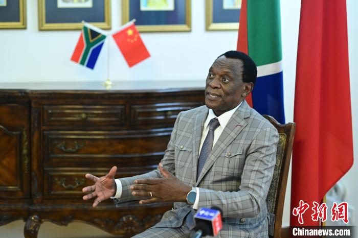 南非駐華大使謝勝文近期在北京接受中新社記者專訪,介紹南中、非中共建“一帶一路”成果?!≈行律缬浾?田雨昊 攝