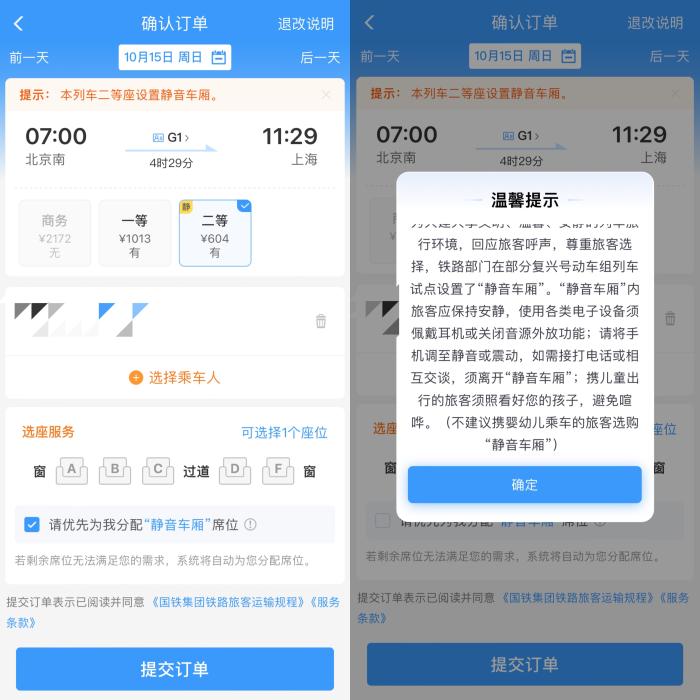 鐵路12306APP購(gòu)票頁面上的“靜音車廂”提示