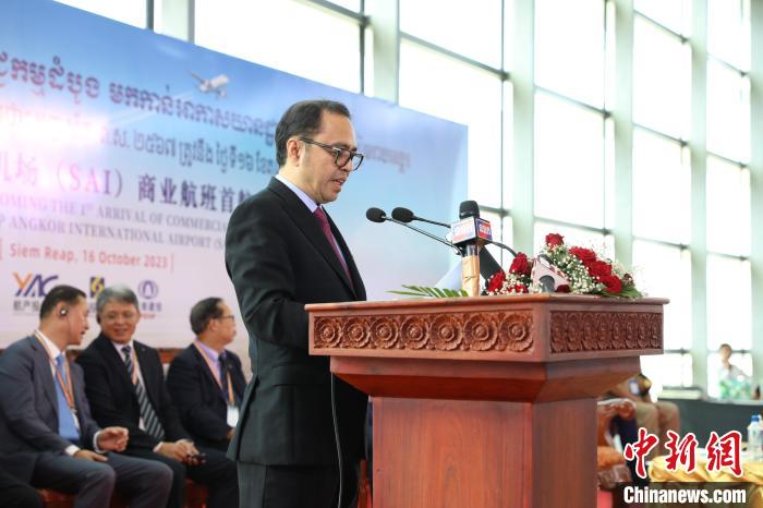 10月16日,柬埔寨暹粒吳哥國際機(jī)場通航運(yùn)營。圖為柬埔寨副首相兼內(nèi)閣辦公廳大臣翁賽維索在首航儀式上致辭 (黎海月 攝)