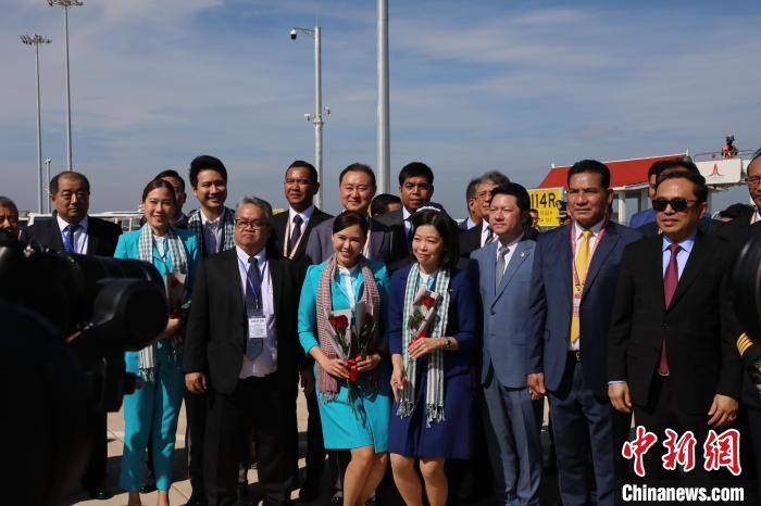 10月16日,柬埔寨暹粒吳哥國際機(jī)場通航運(yùn)營。圖為柬埔寨官員等嘉賓代表在停機(jī)坪與機(jī)組成員合影。(黎海月 攝)