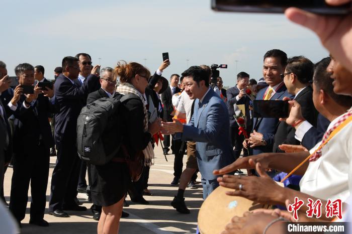 10月16日,柬埔寨暹粒吳哥國際機(jī)場通航運(yùn)營。圖為柬埔寨旅游部大臣宋速更為游客送上鮮花及祝福。(黎海月 攝)