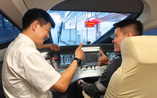 8月25日,在印度尼西亞萬隆的雅萬高鐵德卡魯爾動車所內(nèi),中國師傅穆振(左)在向印尼火車司機塞蒂亞萬講解動車組出庫前的上電作業(yè)。