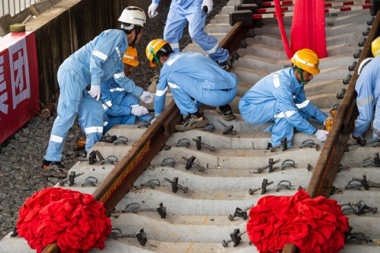 3月31日,在印度尼西亞雅加達雅萬高鐵哈利姆車站,工人鋪設雅萬高鐵全線最后一根鋼軌。