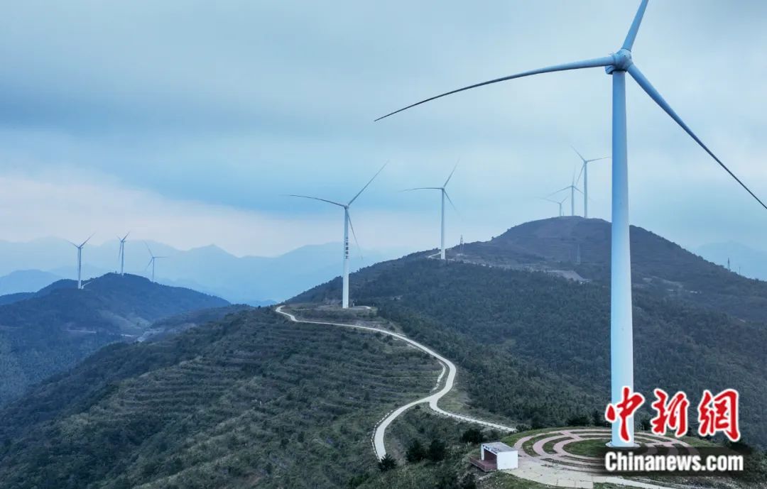 臺州市仙居縣廣度鄉(xiāng)風(fēng)力發(fā)電機(jī)。(無人機(jī)照片)陳月明 攝