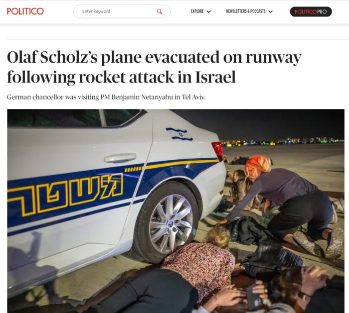 當(dāng)?shù)貢r(shí)間17日晚,德國總理朔爾茨在以色列本古里安機(jī)場(chǎng)登機(jī)前突遇火箭彈襲擊,人員緊急躲避。圖片來源:美國政治新聞網(wǎng)報(bào)道截圖