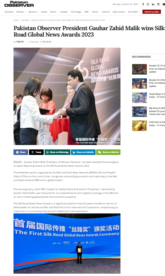 《巴基斯坦觀察家報(bào)》網(wǎng)站報(bào)道首屆國(guó)際傳播“絲路獎(jiǎng)”頒獎(jiǎng)活動(dòng)
