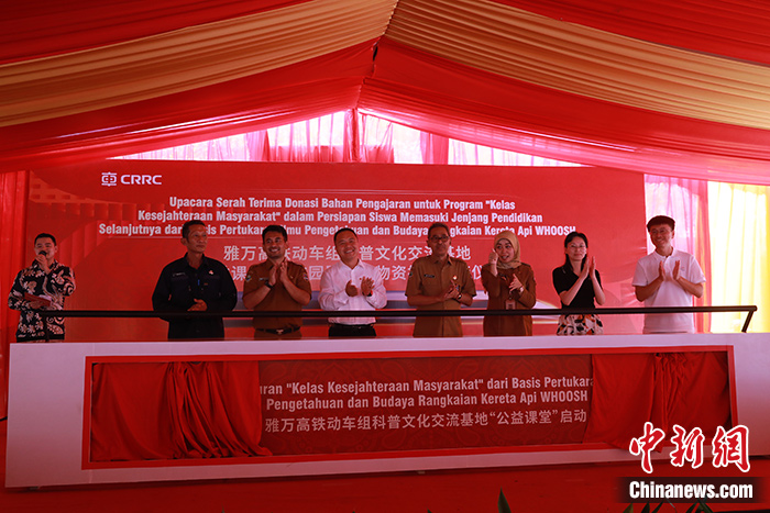 當(dāng)?shù)貢r(shí)間10月24日,雅萬(wàn)高鐵動(dòng)車組科普文化交流基地公益課堂進(jìn)校園暨教學(xué)物資捐贈(zèng)交接儀式在印尼萬(wàn)隆岸普拉第三國(guó)立初級(jí)中學(xué)舉行,這是中國(guó)高鐵公益課堂首次走進(jìn)印尼校園。圖為儀式啟動(dòng)現(xiàn)場(chǎng)。 中新社記者 李志全 攝