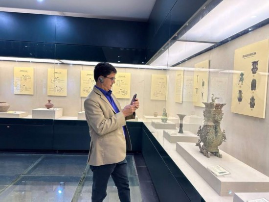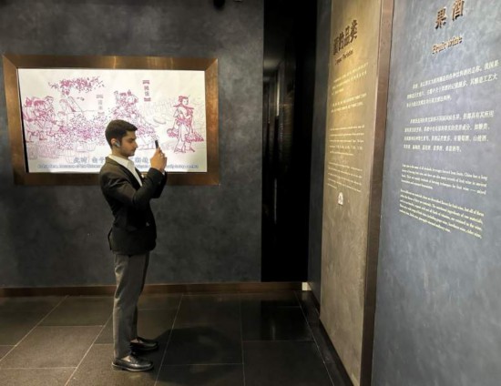 10月23日,2023“一帶一路”媒體合作論壇聯(lián)合采訪(fǎng)團(tuán)團(tuán)員在中國(guó)酒文化城認(rèn)真觀(guān)看展覽。本報(bào)記者 劉書(shū)文攝