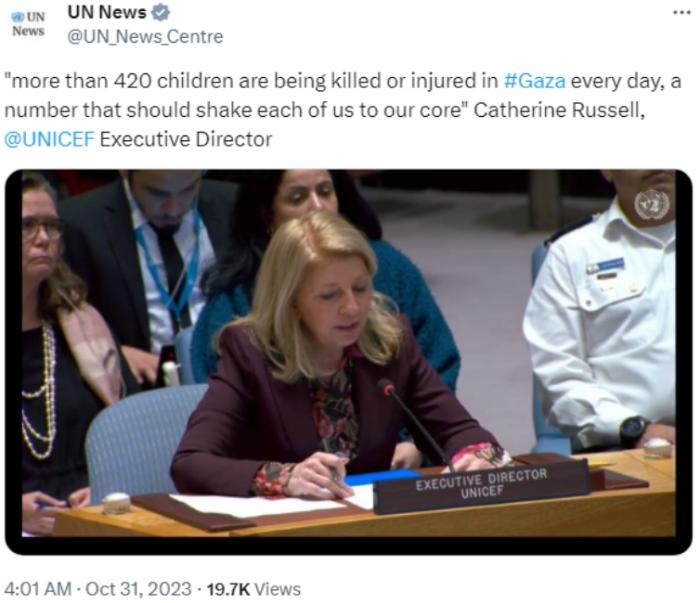 中新網(wǎng)10月31日電 據(jù)聯(lián)合國新聞消息,當(dāng)?shù)貢r間30日,聯(lián)合國兒童基金會執(zhí)行主任凱瑟琳·拉塞爾表示,最新統(tǒng)計數(shù)據(jù)顯示,目前加沙地帶每天至少有420名兒童死亡和受傷。