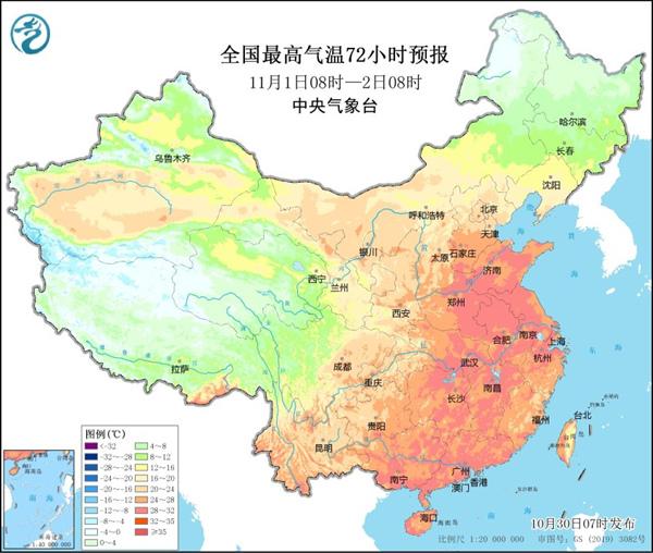 本周前期,中東部升溫還將繼續(xù)。 預(yù)計(jì)本周初,全國大部仍會以升溫為主,并且大幅偏離常態(tài)。特別是華北、黃淮一帶,11月初暖熱程度還會升級,部分地區(qū)最高氣溫甚至?xí)^30℃部分,比如,鄭州,菏澤等地可能在11月1日前后迎來當(dāng)?shù)?1月觀測史上的首個30℃。