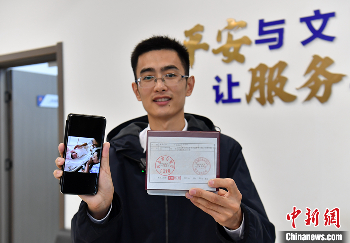 圖為新生兒父親展示女兒照片和帶有“河北雄安新區(qū)”字樣的戶(hù)口頁(yè)。 中新社記者 韓冰 攝