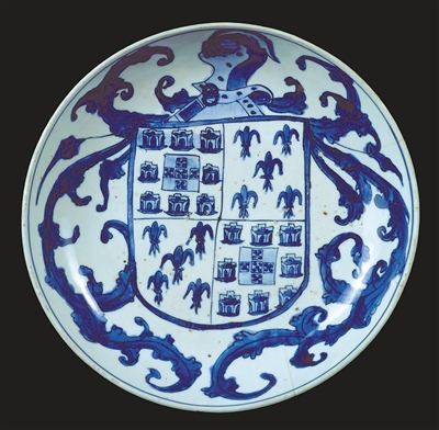 與此同時(shí),葡萄牙貴族開始向中國(guó)專門定制紋章瓷器。據(jù)博物館陶瓷收藏館館長(zhǎng)拉斐爾·阿爾費(fèi)寧介紹,定制瓷器在葡萄牙的最早記載出現(xiàn)于1528年,即明代嘉靖年間。葡萄牙人非常珍視這些中國(guó)瓷器,甚至在返程途中給它們加飾銀制配件。由于當(dāng)時(shí)歐洲人多使用質(zhì)地粗糙的石制或陶制用具,設(shè)計(jì)獨(dú)特、淡雅脫俗且白皙光潔、能耐高溫的中國(guó)瓷器脫穎而出,備受珍視。當(dāng)時(shí),葡萄牙貴族多以中國(guó)瓷器為地位的象征,定制瓷器一時(shí)間蔚然成風(fēng)。其中,由葡萄牙阿爾布克爾克家族定制的瓷盤尤具代表性:盤心繪有盾形紋章,配以十字形盾牌和百合花,藍(lán)白相間,光潔細(xì)膩。這件瓷器珍品既是歐洲藝術(shù)史上的美麗篇章,亦是中葡藝術(shù)交融出的靈感結(jié)晶。
