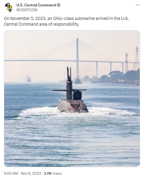 據(jù)報道,當(dāng)天,美國中央司令部在社交媒體上發(fā)帖稱,“11月5日,一艘‘俄亥俄’級戰(zhàn)略潛艇抵達(dá)中東地區(qū)。”