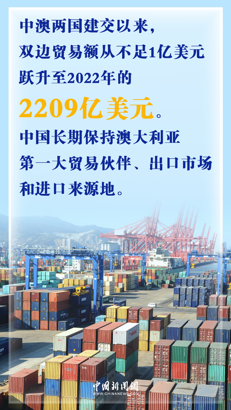 據(jù)中國(guó)駐澳大利亞大使館網(wǎng)站數(shù)據(jù),中澳兩國(guó)建交50年來(lái),雙邊貿(mào)易額從當(dāng)時(shí)不足1億美元,躍升至2022年的2209億美元。中國(guó)長(zhǎng)期保持澳大利亞第一大貿(mào)易伙伴、出口市場(chǎng)和進(jìn)口來(lái)源地的地位。與此同時(shí),越來(lái)越多的澳大利亞優(yōu)質(zhì)農(nóng)產(chǎn)品走進(jìn)中國(guó)家庭,豐富了中國(guó)消費(fèi)者的選擇。