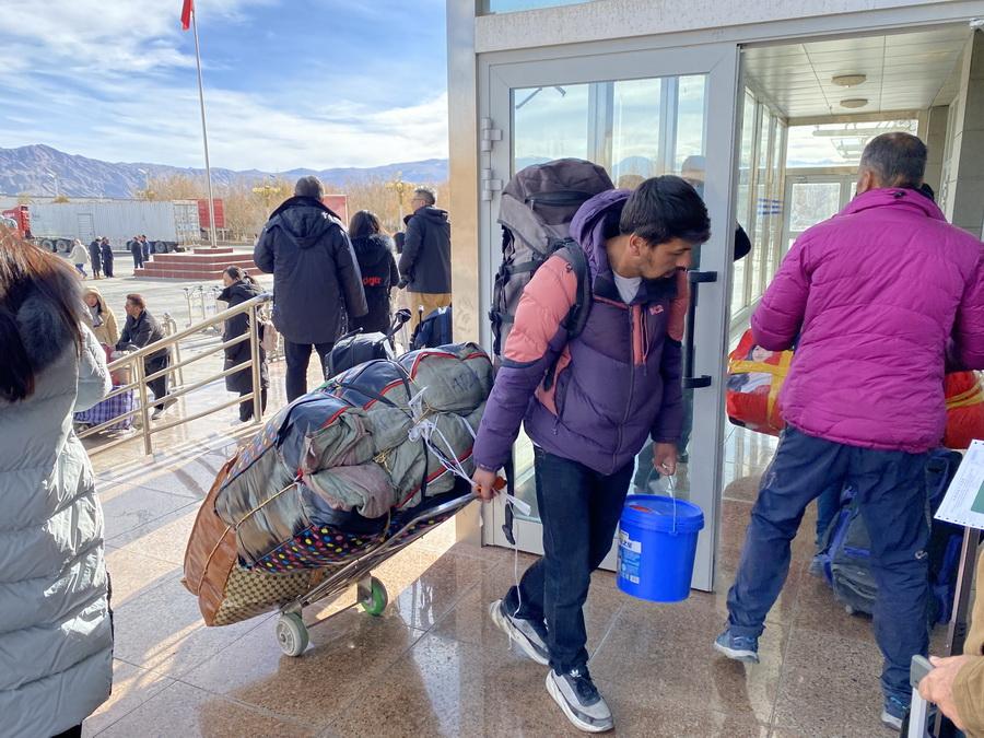 11月6日,紅其拉普口岸聯(lián)檢大廳外,人們?cè)谂抨?duì)通關(guān)。(中國(guó)網(wǎng)記者 王冉 攝)