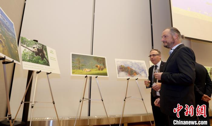 當(dāng)?shù)貢r(shí)間11月8日,中國(guó)駐加拿大使館舉辦國(guó)家公園圖片展暨招待會(huì)。圖為與會(huì)嘉賓觀(guān)看大熊貓國(guó)家公園照片。中新社記者 余瑞冬 攝