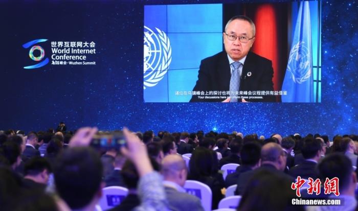 2023年11月8日,2023年世界互聯網大會烏鎮(zhèn)峰會在浙江烏鎮(zhèn)開幕,主題為“建設包容、普惠、有韌性的數字世界——攜手構建網絡空間命運共同體”。圖為聯合國副秘書長李軍華視頻演講。