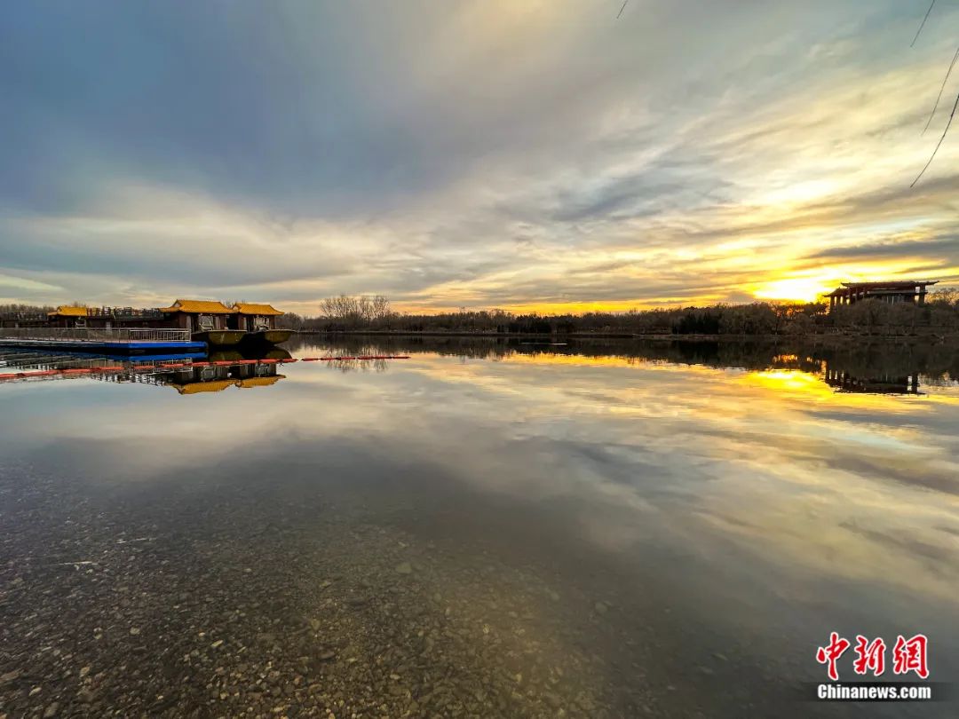 2022年12月11日,夕陽映照大運(yùn)河,北京通州大運(yùn)河森林公園里落日余暉映晚霞,一抹夕陽美如畫。王丹楓 攝