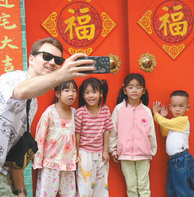 10月14日,在福建省福安市下白石鎮(zhèn)下岐村,撒普爾(左一)與孩子們合影。