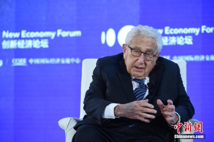 資料圖為2019年11月21日,2019年創(chuàng)新經(jīng)濟(jì)論壇在北京舉行,在“特別會(huì)議—對(duì)話:基辛格博士”環(huán)節(jié),美國前國務(wù)卿、創(chuàng)新經(jīng)濟(jì)論壇名譽(yù)主席亨利·基辛格(Henry Kissinger)出席并發(fā)言。