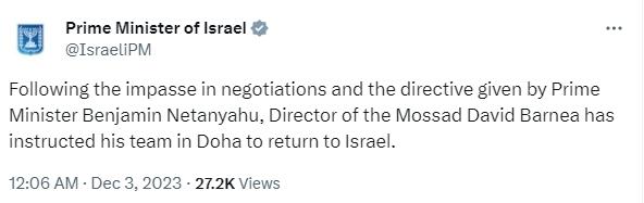 中新網(wǎng)12月3日電 據(jù)卡塔爾半島電視臺報道,當?shù)貢r間2日,以色列總理辦公室發(fā)布聲明稱,以色列已從卡塔爾撤回摩薩德談判代表。