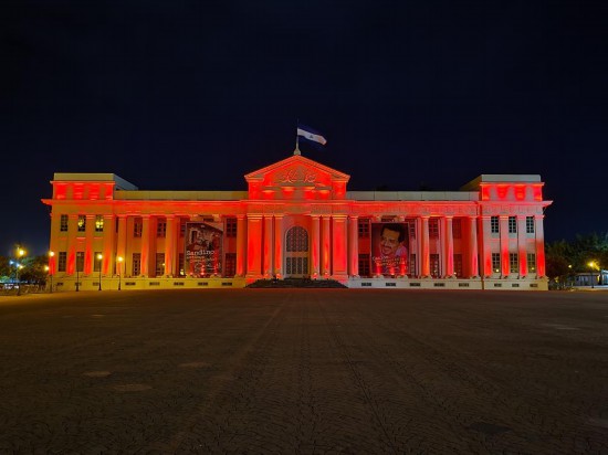 2022年1月31日,尼加拉瓜首都馬那瓜市中心標志性建筑國家宮點亮“中國紅”。新華社發(fā)(中國駐尼加拉瓜使館供圖)