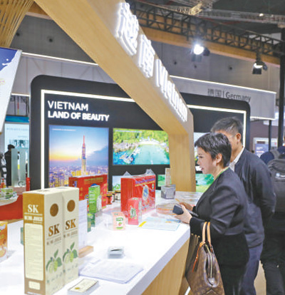 11月6日,參觀者在第六屆進博會國家展越南展臺挑選商品。