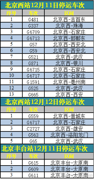 12月11日、12月12日北京西站、北京豐臺(tái)站部分列車(chē)停運(yùn)