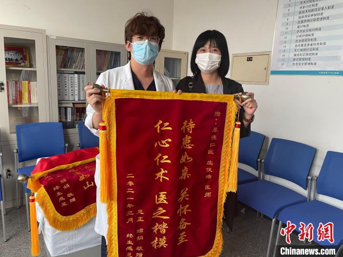 患者出院一個(gè)禮拜以后,專程帶著錦旗來(lái)致謝莊竣皓。受訪者供圖