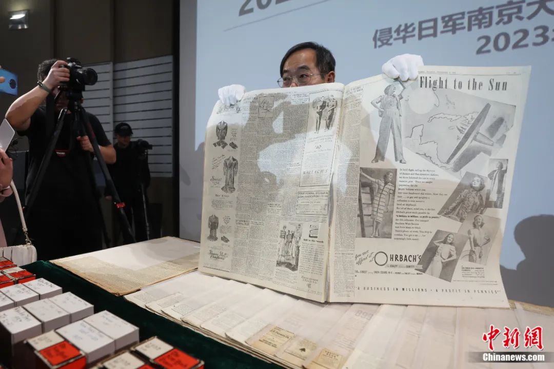 2023年12月8日,侵華日軍南京大屠殺遇難同胞紀(jì)念館舉行2023年新征文物史料新聞發(fā)布會。美籍華人魯照寧向媒體展示1937年12月6日出版的紐約時報,報紙對侵華日軍進(jìn)攻南京做了詳細(xì)報道。泱波 攝