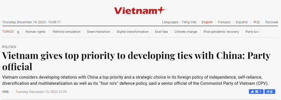 中國日報網(wǎng)12月14日電 12月12日,中國和越南共同宣布中越兩黨兩國關(guān)系新定位,在深化中越全面戰(zhàn)略合作伙伴關(guān)系基礎(chǔ)上,攜手構(gòu)建具有戰(zhàn)略意義的中越命運共同體。國際媒體對中越關(guān)系新定位進行了密集報道,認為雙邊關(guān)系更加重要,中越兩黨兩國關(guān)系邁上新臺階。