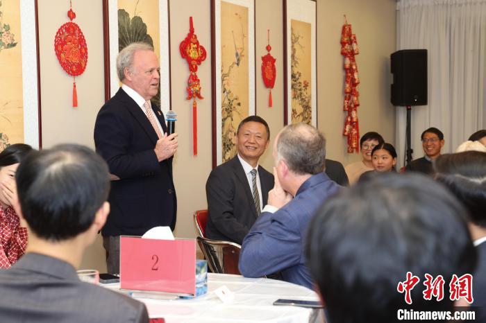 12月16日,加拿大白求恩醫(yī)學(xué)發(fā)展協(xié)會(huì)會(huì)長艾瑞特(站立者)在招待會(huì)上發(fā)言。中新社記者 余瑞冬 攝