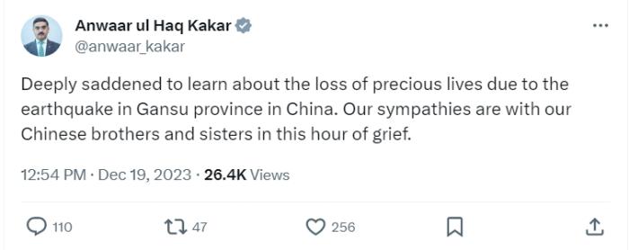 中新網(wǎng)12月19日電 綜合報道,12月18日,甘肅臨夏州積石山縣發(fā)生6.2級地震。19日,巴基斯坦總理卡卡爾在社交平臺上發(fā)帖稱,對中國甘肅省地震中失去的寶貴生命深感悲痛。