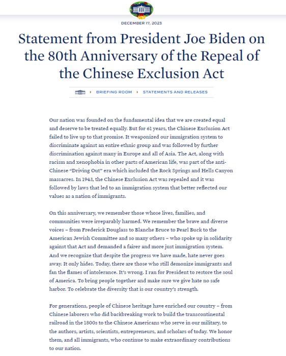 當(dāng)?shù)貢r(shí)間2023年12月17日,薛海培終于等到了白宮的文告。美國總統(tǒng)拜登在文告中指出,“人人生而平等,應(yīng)該受到平等對待”,但《排華法案》與這一理念背道而馳,“它將我們的移民制度武器化,歧視整個(gè)種族群體,隨后又進(jìn)一步歧視歐洲和整個(gè)亞洲的許多人?!?/p>