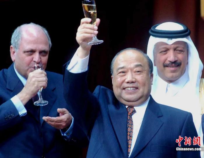2001年11月12日,中國加入WTO議定書簽字儀式在卡塔爾首都多哈舉行,時任外經(jīng)貿(mào)部部長石廣生在簽字后同各國代表一起舉杯慶祝。錢興強(qiáng) 攝