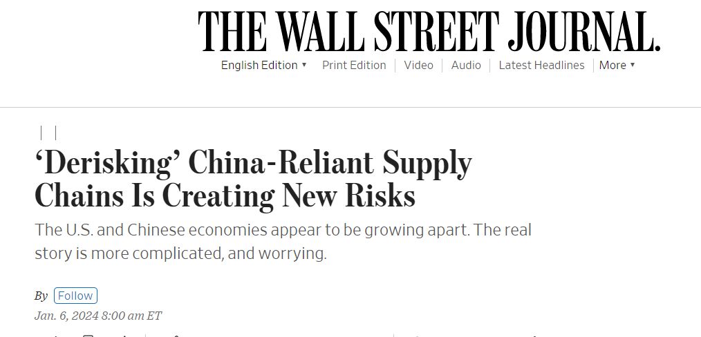 中國(guó)日?qǐng)?bào)網(wǎng)1月8日電 美國(guó)《華爾街日?qǐng)?bào)》網(wǎng)站報(bào)道稱,最新研究揭示了美西方針對(duì)中國(guó)供應(yīng)鏈實(shí)施“去風(fēng)險(xiǎn)化”政策的實(shí)際效果。初步結(jié)論令人擔(dān)憂:旨在打造彈性供應(yīng)鏈的相關(guān)措施,可能是虛幻的。結(jié)果將導(dǎo)致全球供應(yīng)鏈變得更為復(fù)雜,反而會(huì)產(chǎn)生新的風(fēng)險(xiǎn)。
