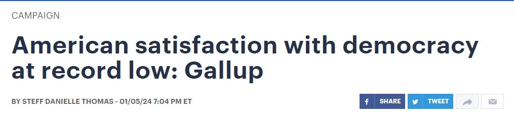 中國(guó)日?qǐng)?bào)網(wǎng)1月8日電 據(jù)美國(guó)《國(guó)會(huì)山報(bào)》網(wǎng)站5日?qǐng)?bào)道,蓋洛普公司(Gallup)5日公布的民調(diào)顯示,只有28%的美國(guó)成年人對(duì)該國(guó)的民主現(xiàn)狀感到滿意,較2021年1月6日美國(guó)“國(guó)會(huì)山騷亂”事件發(fā)生后不久的35%的調(diào)查結(jié)果又有了明顯的下降,創(chuàng)歷史新低。