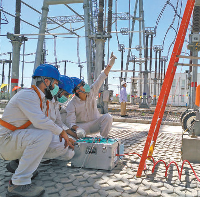 在巴基斯坦默蒂亞里—拉合爾直流輸電項目現(xiàn)場,中巴工程師對設(shè)備開展日常檢修。