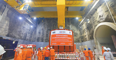 2023年6月10日,工人在巴基斯坦蘇吉吉納里水電站吊裝最后一臺機組轉(zhuǎn)子。