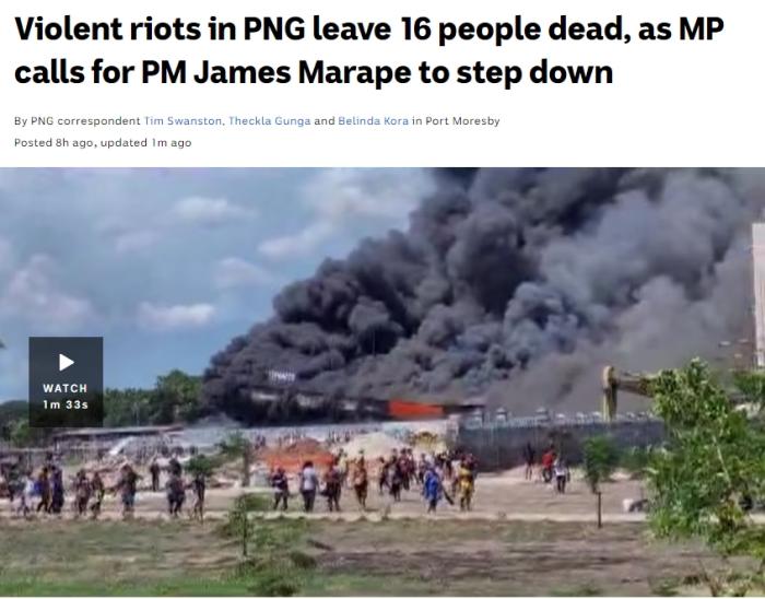 據澳大利亞廣播公司(ABC)報道,當天,巴新部分民眾利用警察罷工的機會縱火焚燒商店和企業(yè)設施,目前騷亂已造成16人遇難,其中首都莫爾斯比港有9人死亡,第二大城市萊城則有7人死亡。