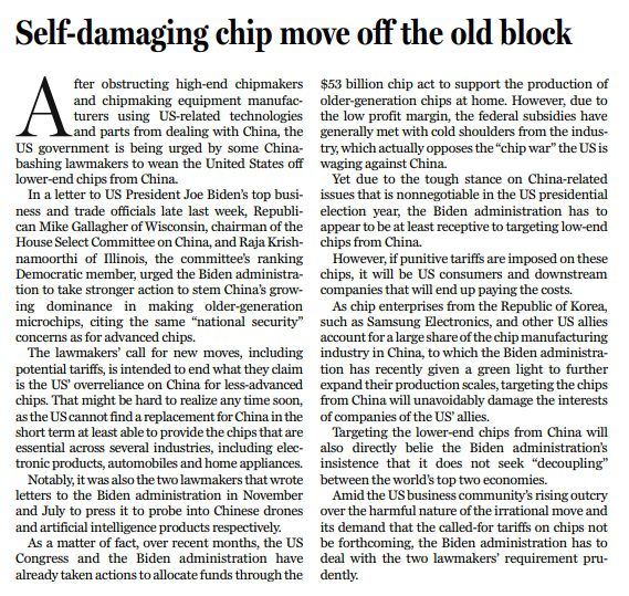 美國部分國會議員近期再次炒作中國芯片安全威脅,其行動可以說是“理智不多但傷害性不小”,加上所謂追加關(guān)稅的要求,更是在美國企業(yè)界激起極大反對之聲。與中國“脫鉤斷鏈”最終只會得不償失,究竟如何應(yīng)對,奉勸拜登政府還是審慎而行。